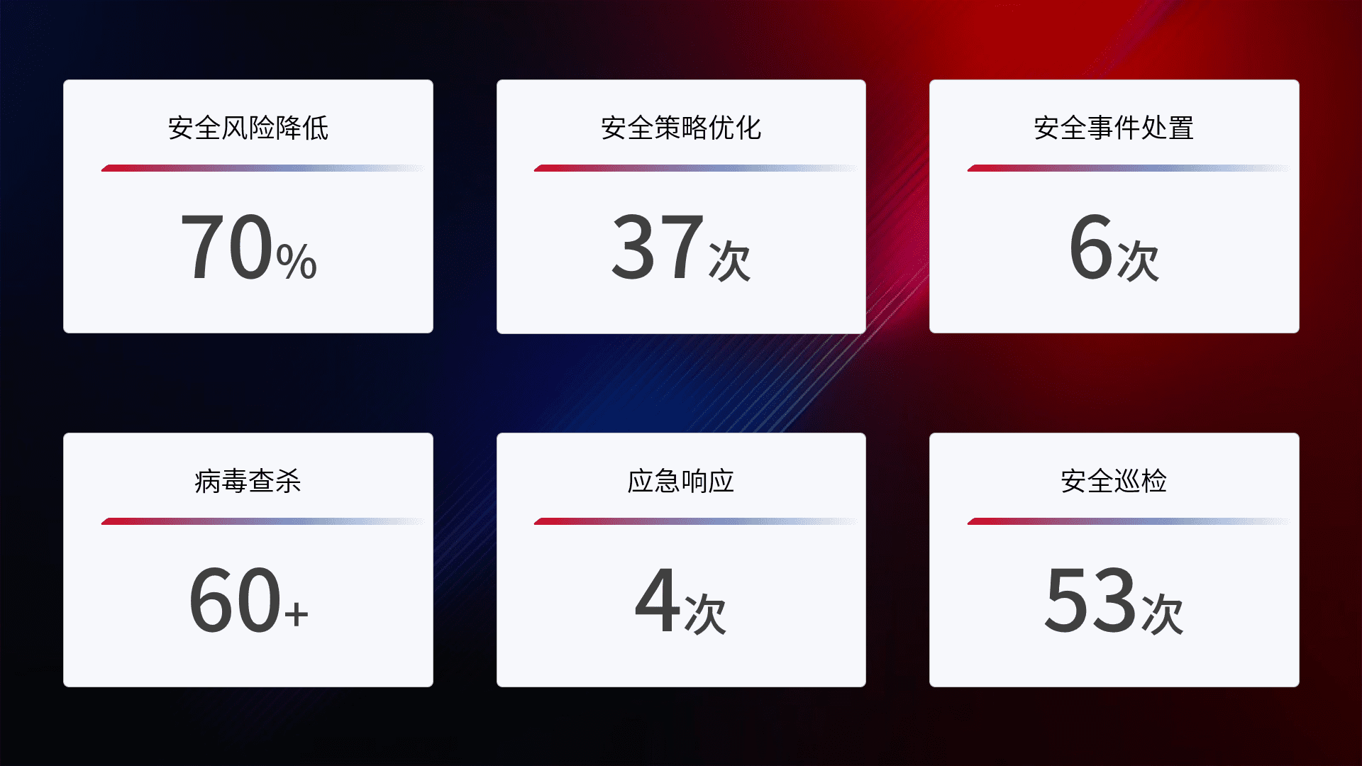 提供全面的安全事件报告体系,,,包括处置报告、、、周报、、季度和年度总结,,,,结合持续监控,,,帮助客户深入了解网络安全状况。。