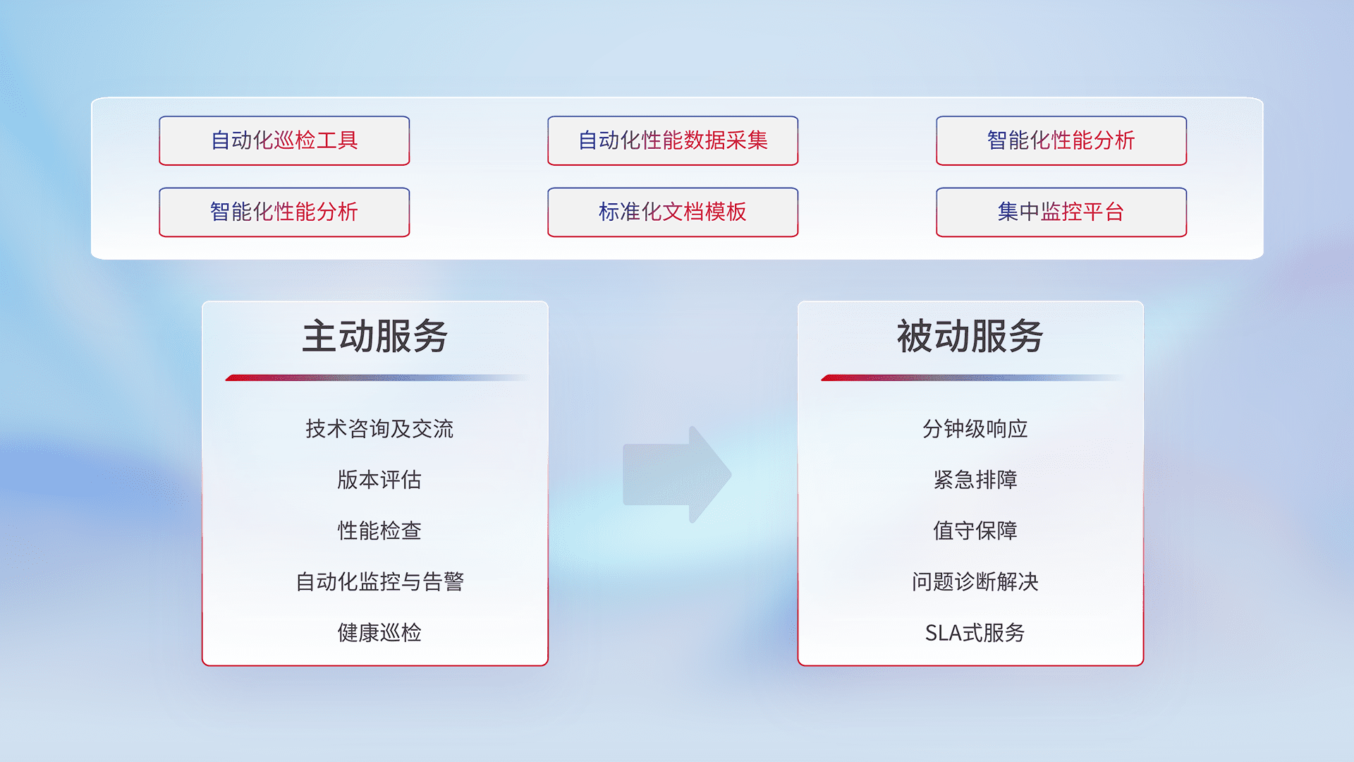智能化工具和标准化文档,,保障服务质量,,,,提供主动服务(包含技术咨询、、、版本评估、、、、性能检查、、自动化监控与告警、、、健康巡检)和被动服务包含(分钟级响应、、、紧急排障、、、、值守保障、、、、问题诊断解决、、SLA服务)。。。。