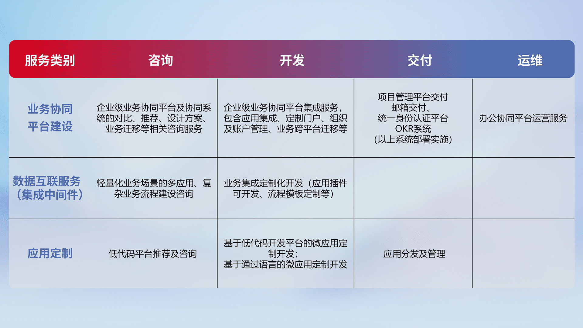 针对钉钉、、企微、、IDaas等平台级产品提供产品的规划、、方案、、交付、、、定制化开发等服务,,,,实现如统一协同办公、、、智能客户服务、、、、混合会议管理、、、、智能数据查询、、、等业务场景,,,实现数字化转型。。